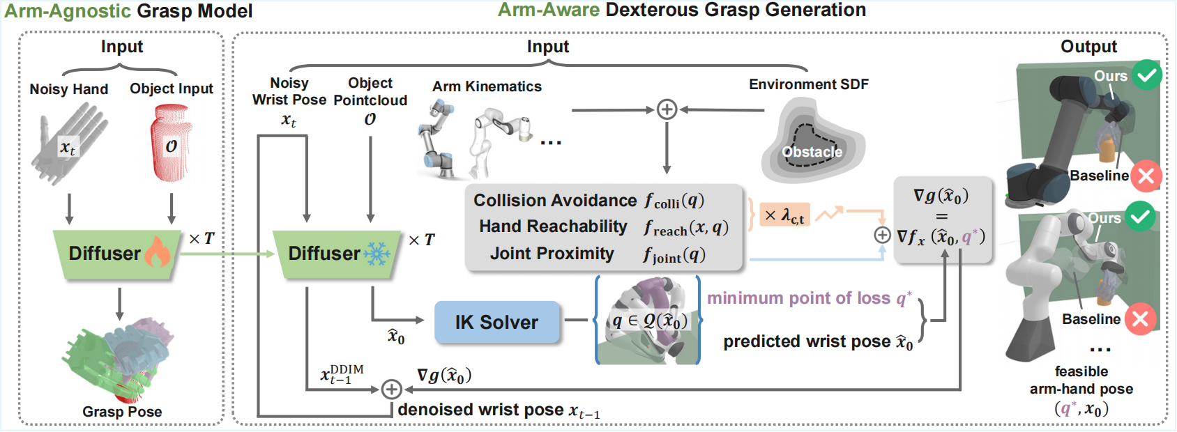 Overview of the proposed arm-aware dexterous grasp generation method. Initially, we pretrain an arm-agnostic diffusion model to capture the distribution of wrist poses for floating hands. During sampling, arm kinematics and environment SDF are integrated as constraints, with their gradients guiding the denoising process. This approach significantly enhances the proportion of feasible grasps, adaptable to various arm-hand configurations and constrained environments.